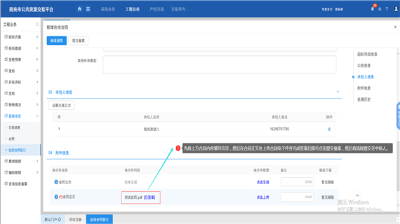 點擊新增在線合同后會進(jìn)入到合同公告編輯頁面,首先將上方的合同內(nèi)容填寫完畢,然后在附件信息中上傳合同電子件,上傳后先將電子件轉(zhuǎn)換成pdf然后再pdf格式的合同上完成簽章。簽章結(jié)束后點擊左上角提交備案將流程提交至中標(biāo)人。