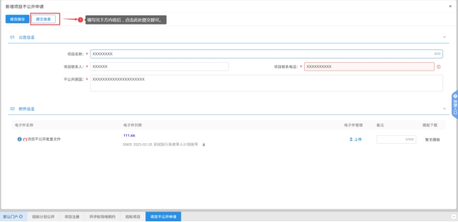 對(duì)于不需要進(jìn)行招標(biāo)計(jì)劃發(fā)布的特別項(xiàng)目,需進(jìn)入工程業(yè)務(wù)后先選擇左側(cè)“項(xiàng)目不公開申請(qǐng)”然后點(diǎn)擊上方的“新增項(xiàng)目不公開申請(qǐng)”。將編輯頁面內(nèi)容填寫完畢后,待市交易中心受理科審核完畢即可。