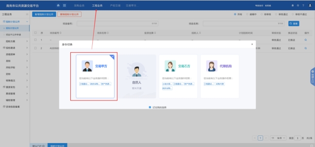 跳轉(zhuǎn)南充市公共資源交易平臺(tái)后選擇“交易甲方”身份進(jìn)入“工程業(yè)務(wù)”模塊(第一次登錄需選擇),如下圖所示: