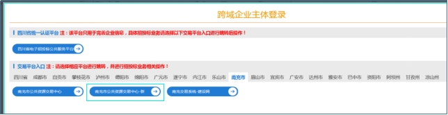 登錄完成后進(jìn)入首頁,選擇“南充市”→“南充市公共資源交易中心-新”進(jìn)入系統(tǒng),如下圖所示: