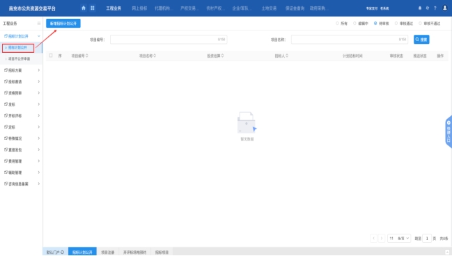對(duì)于需要招標(biāo)計(jì)劃發(fā)布的項(xiàng)目,進(jìn)入工程業(yè)務(wù)后先選擇左側(cè)“招標(biāo)計(jì)劃公開”然后點(diǎn)擊上方的“新增招標(biāo)計(jì)劃公開”。
