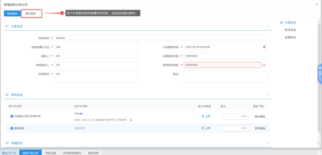 進(jìn)入后按照要求內(nèi)容填寫完畢(招標(biāo)計(jì)劃公開電子件上傳需加蓋招標(biāo)人公章),點(diǎn)擊左上角提交按鈕后,待市交易中心受理科審核完畢即可。