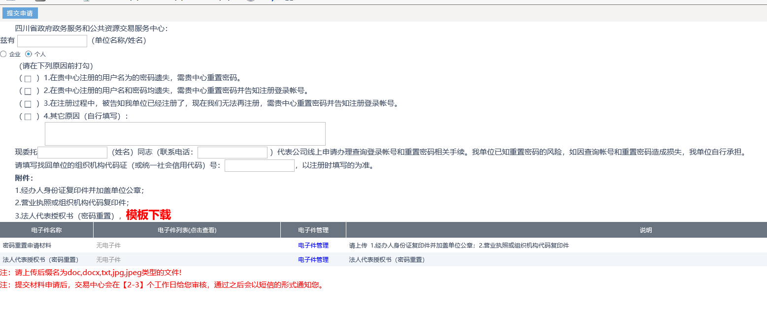 2、填寫相關(guān)資料,點(diǎn)擊【提交申請(qǐng)】按鈕提交審核。如需加急處理,請(qǐng)聯(lián)系交易中心,審核通過(guò)后,在您預(yù)留的手機(jī)號(hào)碼上會(huì)收到短信通知,短信上會(huì)告知賬號(hào)和密碼。電話:028-12345