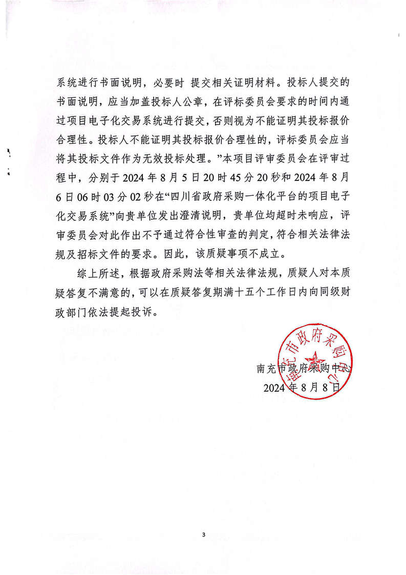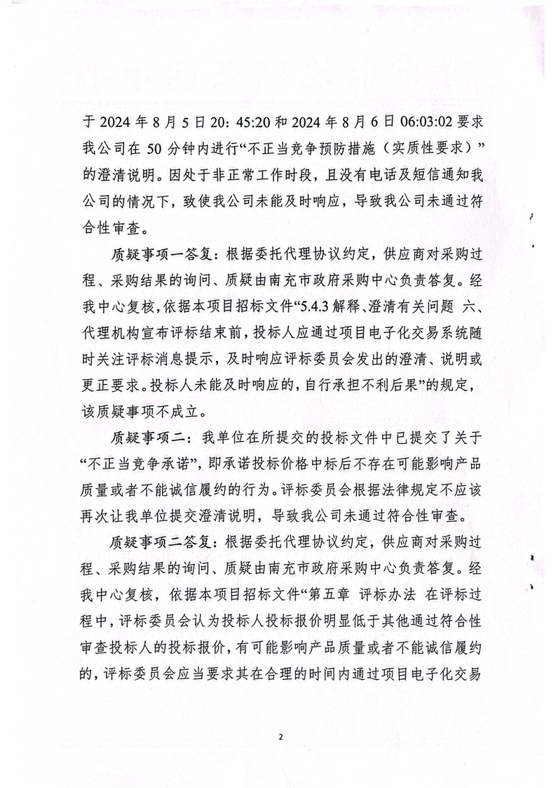 南充市政府采購中心關(guān)于四川省南充市自然災(zāi)害應(yīng)急能力提升工程基層防災(zāi)項目的質(zhì)疑答復(fù)