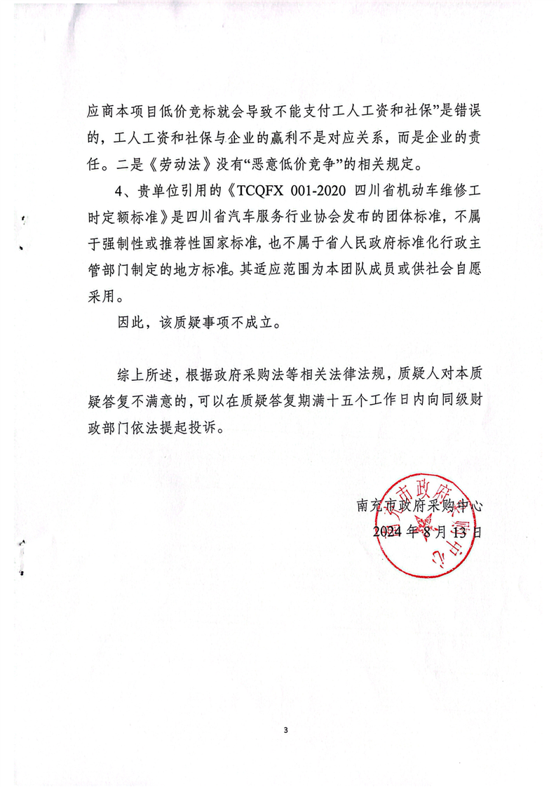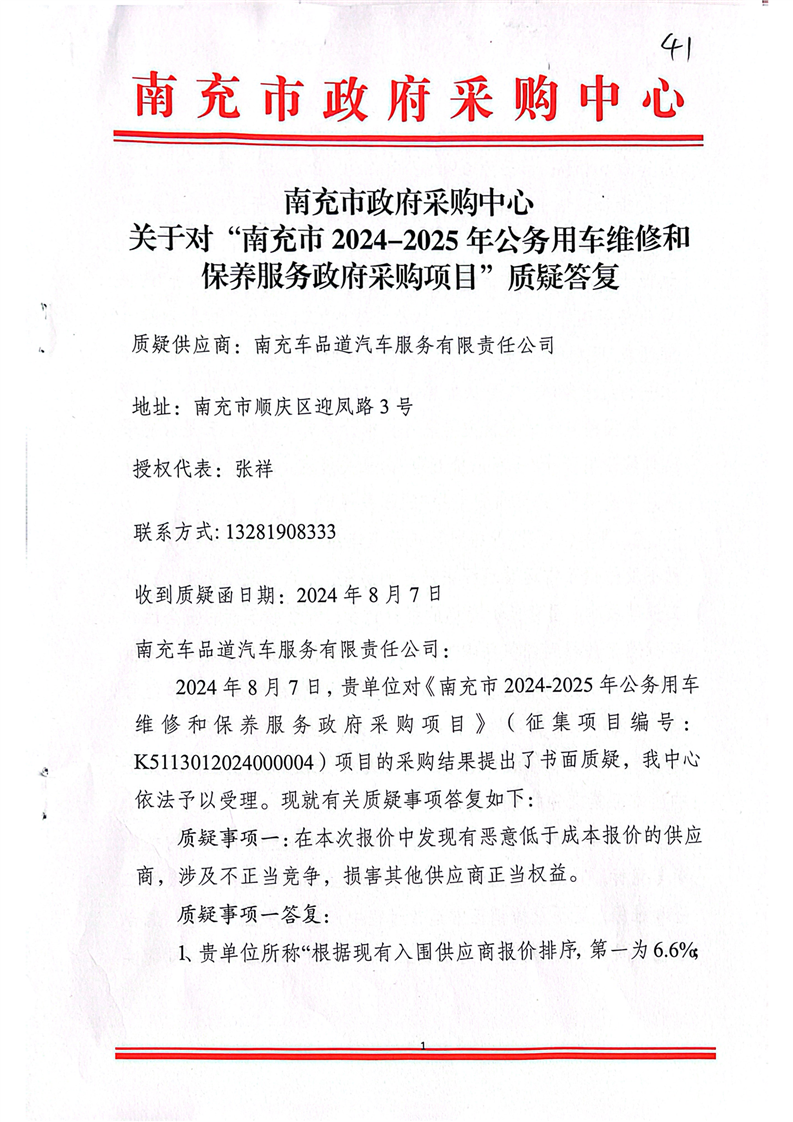 南充市政府采購(gòu)中心關(guān)于對(duì)“南充市2024-2025年公務(wù)用車維修和保養(yǎng)服務(wù)政府采購(gòu)項(xiàng)目”質(zhì)疑答復(fù)(南充車品道汽車服務(wù)有限責(zé)任公司)