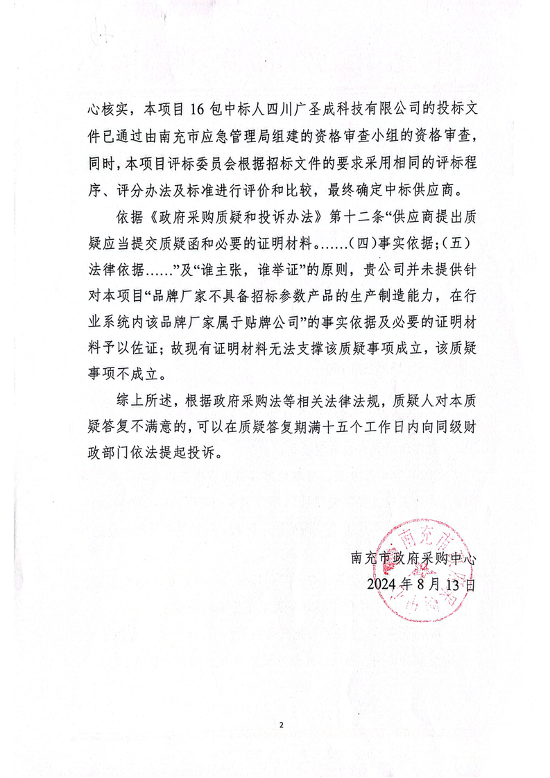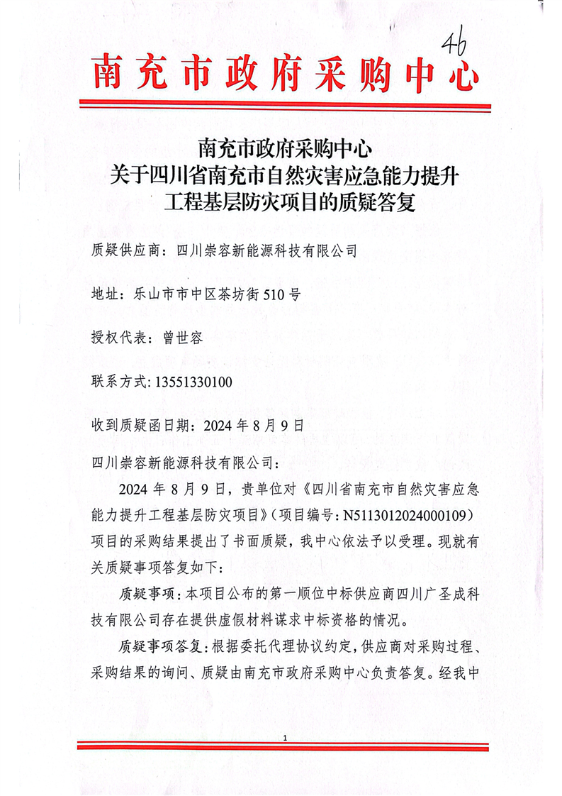 南充市政府采購(gòu)中心關(guān)于四川省南充市自然災(zāi)害應(yīng)急能力提升工程基層防災(zāi)項(xiàng)目的質(zhì)疑答復(fù)(四川崇容新能源科技有限公司)