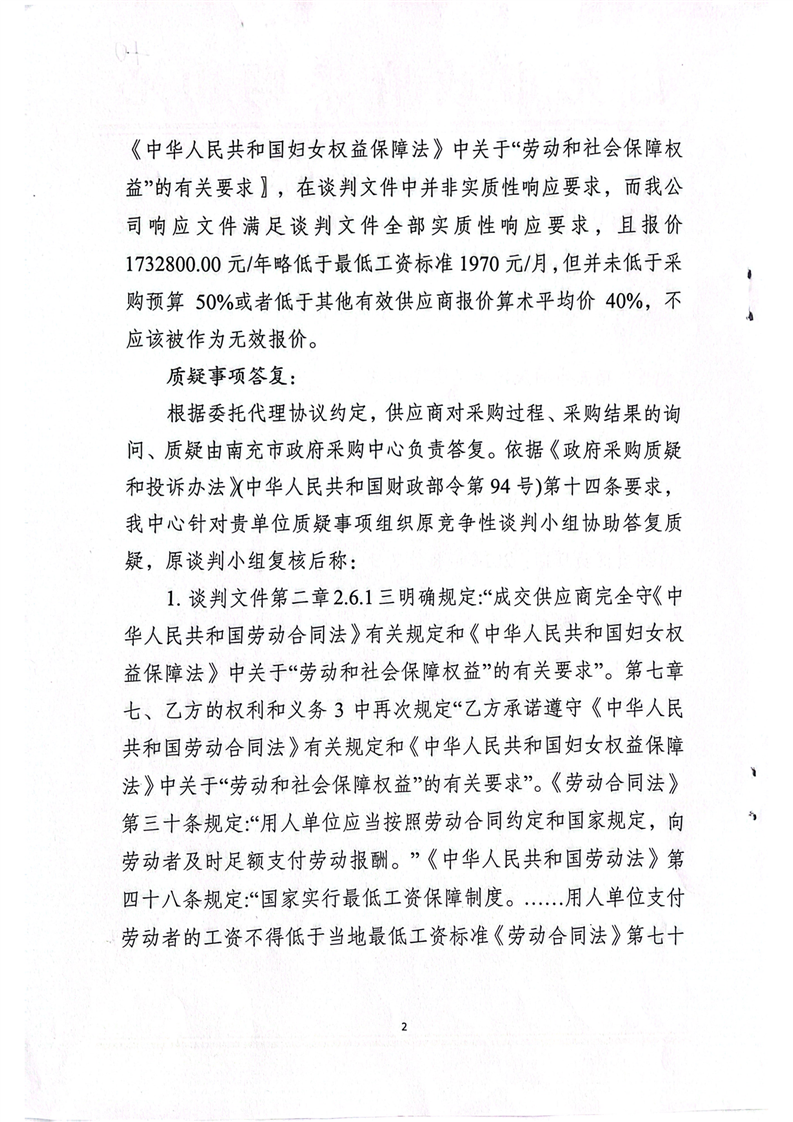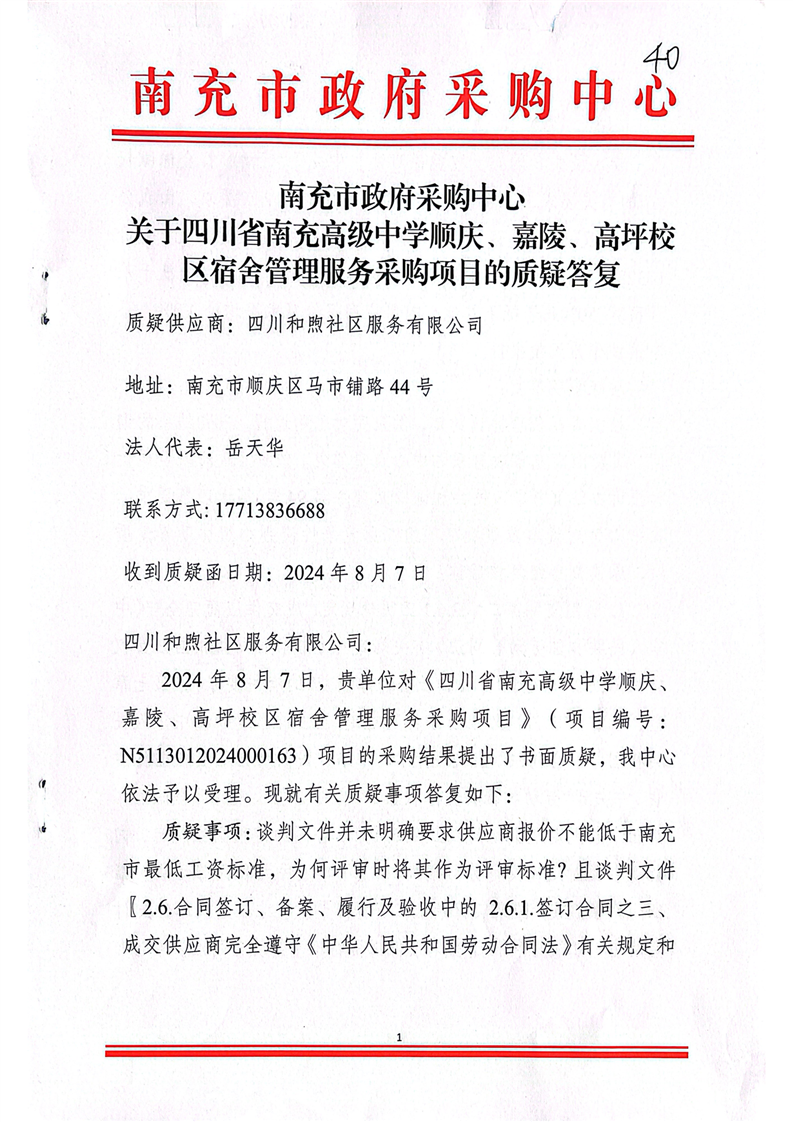 南充市政府采購中心關(guān)于四川省南充高級(jí)中學(xué)順慶、嘉陵、高坪校區(qū)宿舍管理服務(wù)采購項(xiàng)目的質(zhì)疑答復(fù)
