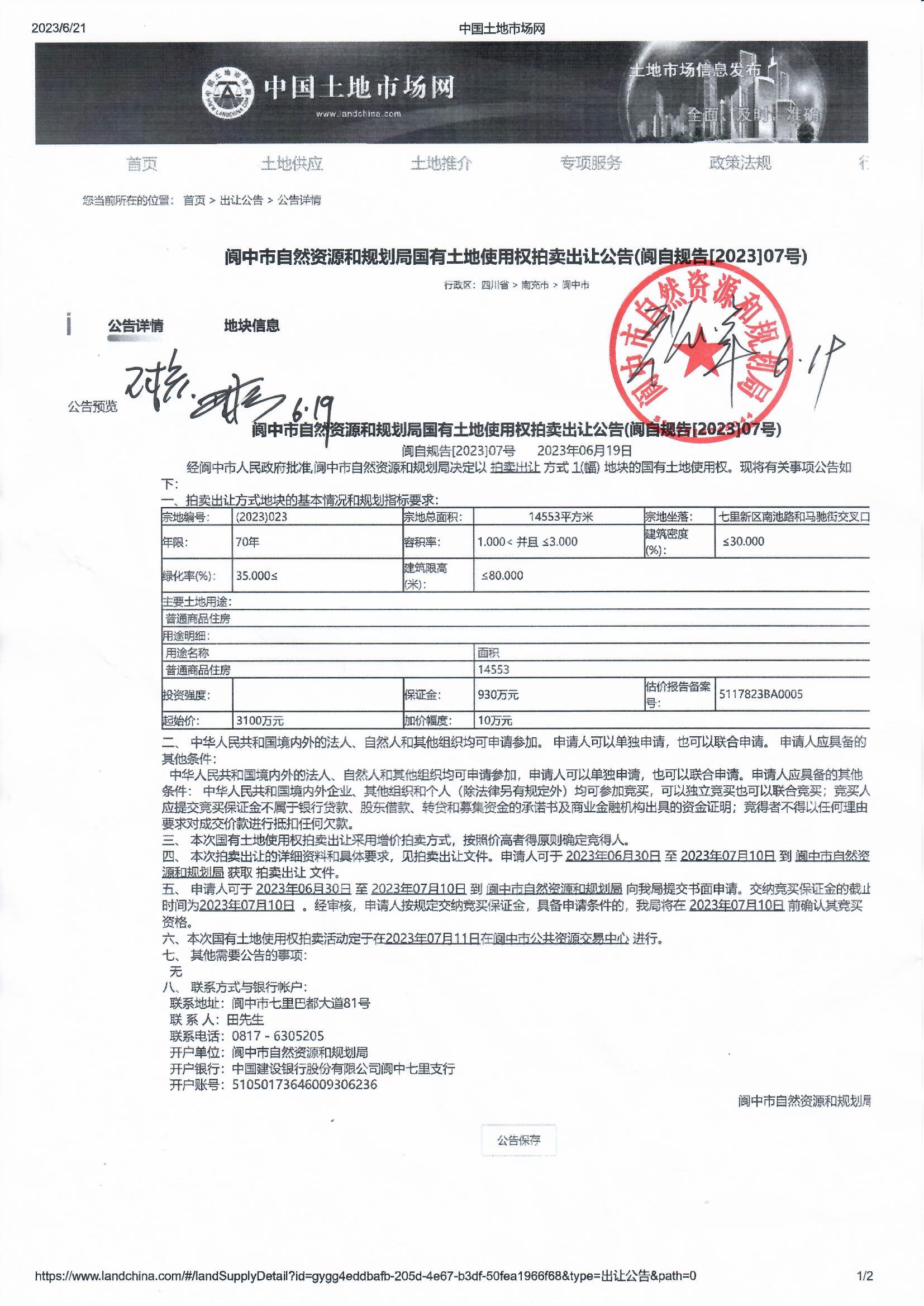 閬中市自然資源和規(guī)劃局國有土地使用權拍賣出讓公告(閬自規(guī)告[2023]07號)