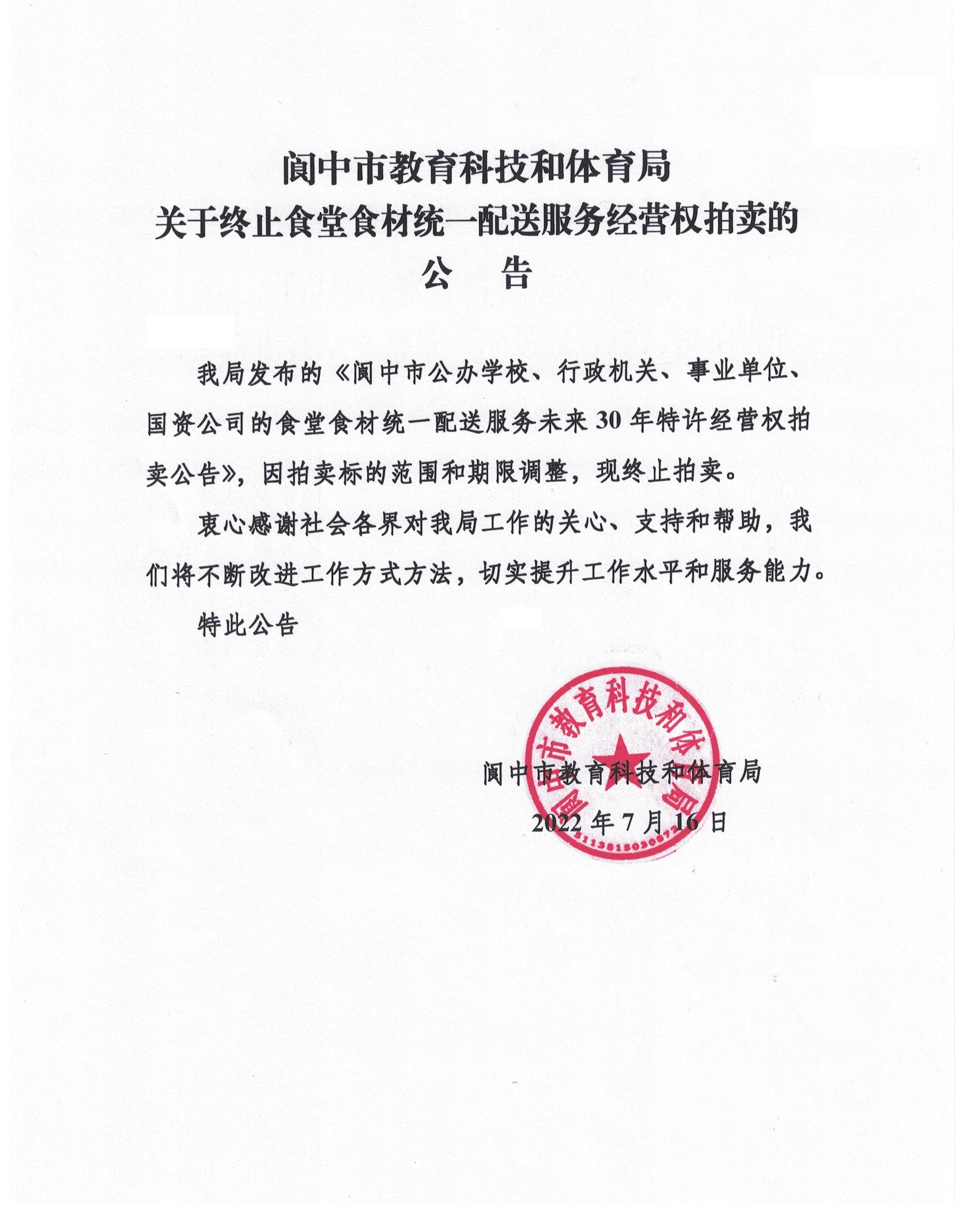 閬中市教育科技和體育局關于終止食堂食材統(tǒng)一配送服務經(jīng)營權(quán)拍賣的公告
