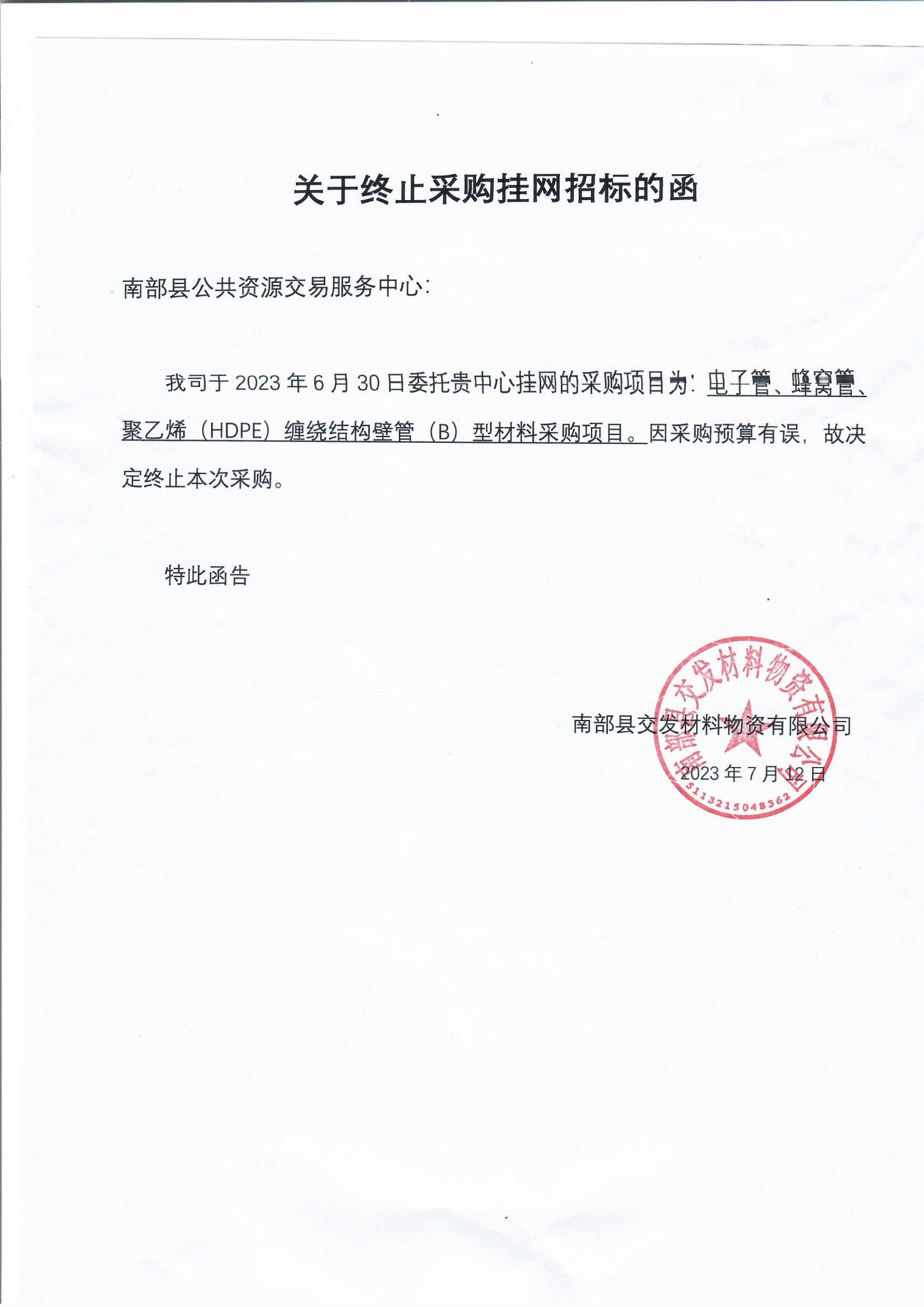南部縣交發(fā)材料物資有限公司電力管、蜂窩管、聚乙烯(HDPE)纏繞結(jié)構(gòu)壁管(B)型材料采購(gòu)項(xiàng)目終止公告
