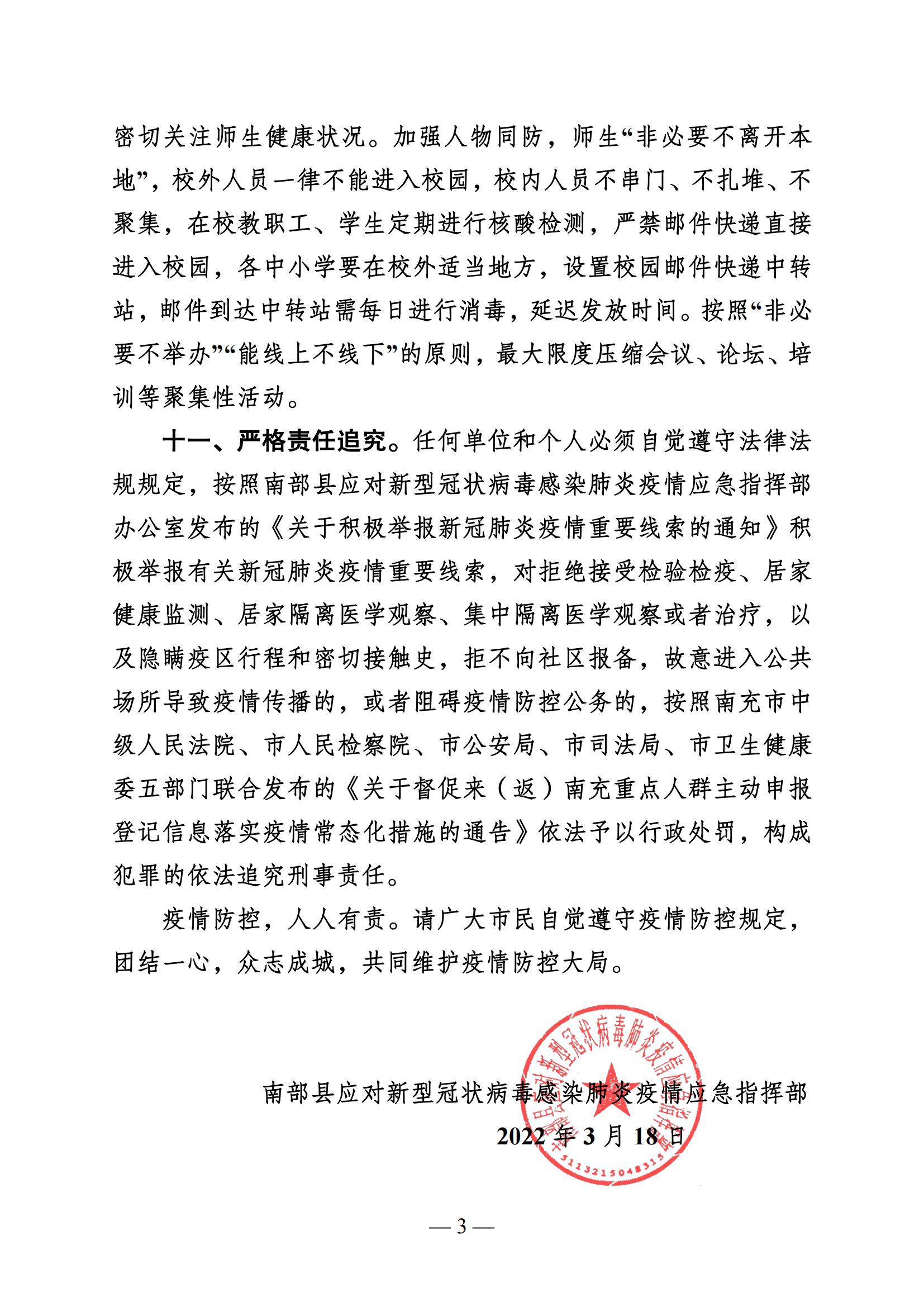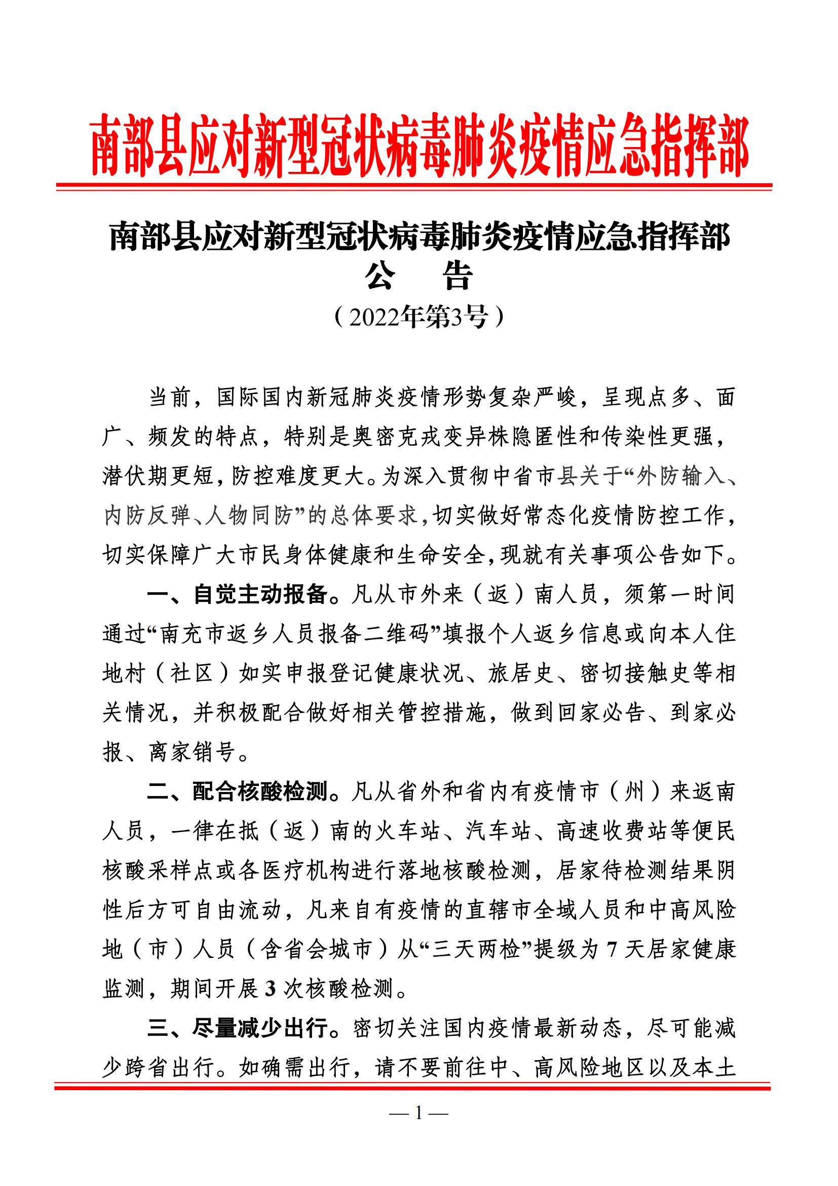 南部縣應對新型冠狀病毒肺炎疫情應急指揮部公告(2022年第3號)