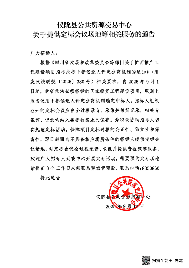 儀隴縣公共資源交易中心關(guān)于提供定標(biāo)會(huì)議場(chǎng)地等相關(guān)服務(wù)的通告