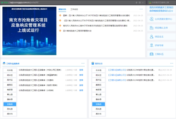 2023年4月20日,按照《儀隴縣搶險救災(zāi)工程項目及工程隊伍儲備庫管理辦法》的相關(guān)規(guī)定,在儀隴縣應(yīng)急管理局、公共資源交易中心的組織見證和行業(yè)主管部門自規(guī)局的現(xiàn)場監(jiān)督下,儀隴縣公共資源交易中心采取隨機抽取方式從南充市搶險救災(zāi)應(yīng)急響應(yīng)管理系統(tǒng)工程隊伍儲備庫中抽取出了儀隴縣地質(zhì)災(zāi)害應(yīng)急處置項目的施工、設(shè)計和監(jiān)理單位。抽取完成后系統(tǒng)自動通過南充市搶險救災(zāi)應(yīng)急響應(yīng)管理系統(tǒng)和南充市公共資源交易中心網(wǎng)站進(jìn)行了結(jié)果公示。